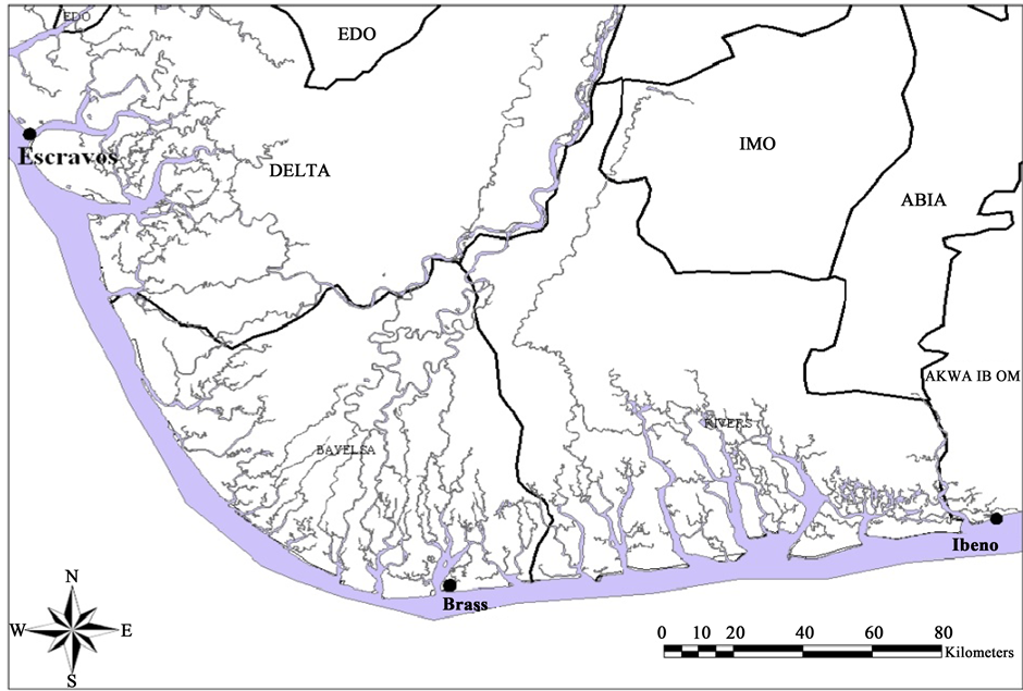 The Niger Delta is a large curve shaped delta which is located in Southern Nigeria like some other deltaic environments in the world. It occupies an area lying between longitude 4˚E - 9˚E and latitude 4˚N - 6˚N. It is bounded in the west by the Calabar flank, in the north by the Anambra platform and in the south by the Atlantic Ocean under which it extends Figure 1 and Figure 3. Both marine and mixed continental depositional environment characterize the Niger Delta of Nigeria [10] . The Niger Delta covers an area of about 75,000 km2 (28,957 mi2) in southern Nigeria, where the Niger Delta discharges its water into the Atlantic Ocean through a series of distributaries.