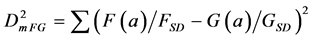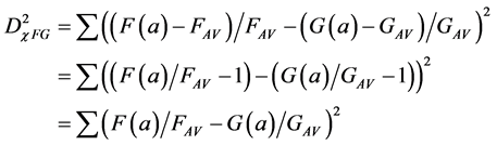 One disadvantage of Euclidean distances and correlations are their sensitivity to a multiplication by a constant. For example, suppose the two measurements F and G have approximately the same variance and one would then multiply one of the measurement, say F(a), with the constant value of “10”. A multiplication of a measurement by such a constant does not change the information content of that measurement. However, the correlation value CFG between the measurements F and G (Equation (1)) will increase by a factor 10. The Euclidean square distance will, after this multiplication, be totally dominated by the FVAR term which will then be one hundred times larger than the corresponding GVAR term in (Equation (4)).