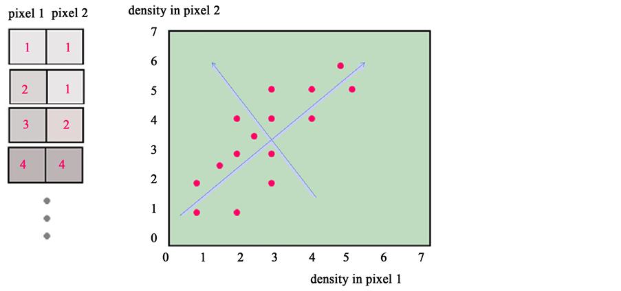 The entire raw data set, in our example, consists of 200,000 images of each 90,000 pixels or a total of 18 × 109 pixel density measurements. In the hyperspace representation, this translates to a cloud of 200,000 points in a 90,000 dimensional hyperspace, again consisting of 18 × 109 co-ordinates. Each co-ordinate corresponds to one of the original pixel densities, thus the hyperspace representation does not change the data in any way. This type of representation is illustrated in Figure 1 for a data set simplified to the extreme, where each image consists of just two pixels.