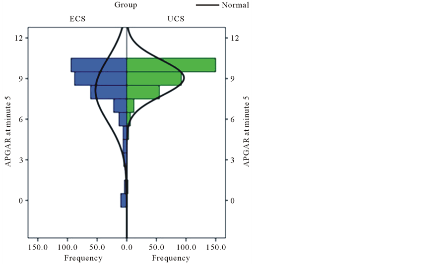 Figure 1. Distribution of APGAR value after 5 minutes for cases and controls. The figure shows the five minute APGAR levels of neonates which underwent emergency cesarean section and urgent cesarean section. The difference between the two groups was significant in the Wilcoxon test with p < 0.001.