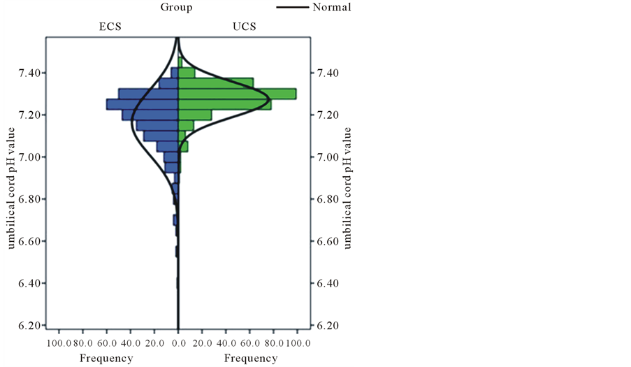 Figure 2. Distribution of umbilical cord pH value for cases and controls. The figure shows the umbilical cord pH values of neonates born by emergency cesarean section compared with neonates which underwent urgent cesarean section. The difference between the two groups was significant in the Wilcoxon test with p < 0.001.