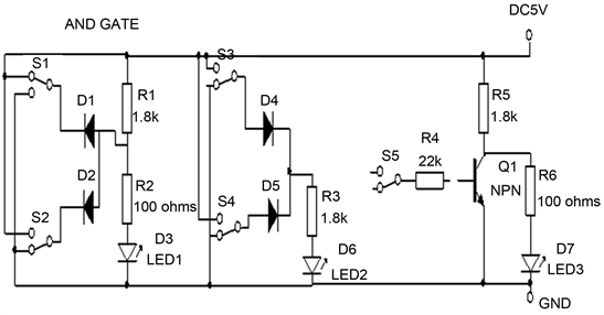 3) AND, OR, NOT Gate Simulator Section. Figure 3 is the schematic design of the AND, OR, NOT gate simulator section. This section demonstrates the basic principles of a logic gate. The term “gate” means that it is either open (ON) or closed (OFF) like a gate in a wall [9]. The gates used in the simulation are the basic gates of AND, OR, and NOT. It is the simplest type of gates and the most practical gates used in electronics. In this part of the device, the functions of AND, OR, and NOT Gate are simulated using an equivalent circuit. AND gate is simulated using two switches connected in series with Light Emitting Diode (LED) as an output indicator. OR Gate on the other hand is simulated using two switches connected in parallel with an LED also as its output indicator. NOT Gate is also simulated using a single switch with a transistor which will act as an