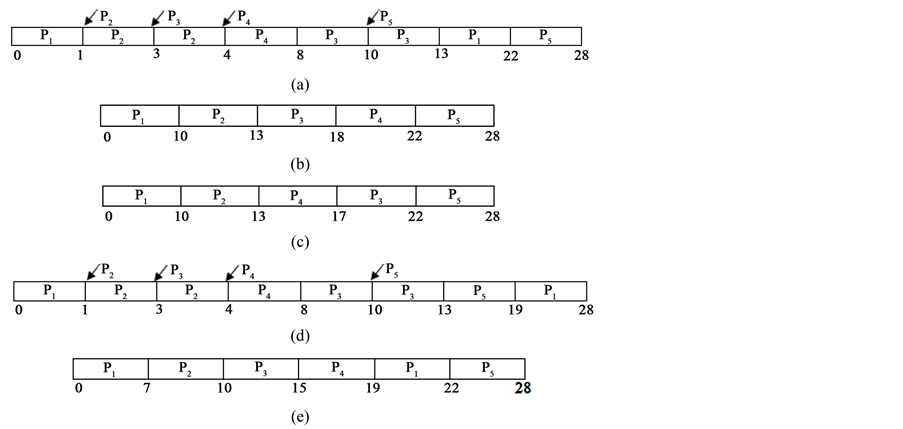 Figure 4. Gantt charts when burst time is in random order for Case II- art I. (a) Gantt chart for CEHIPN with random order of burst time and n = 1; (b) Gantt chart for CEHIPN with random order of burst time and n = 2; (c) Gantt chart for FCFS with random order of burst time; (d) Gantt chart for SJF with random order of burst time; (e) Gantt chart for SRTF and CEHIPN n=3 with random order of burst time.