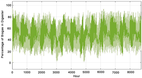 Figure 13 shows the variations of biogas in biogas digester in terms of percentage for a period of one year. As expected, the percentage of biogas varies between 0% and 100%. From the graph, it can be observed that the percentage of biogas reduces to very low levels for the hour 3000 to 3500 corresponding to December in the data considered. This is due to low insolation during winter, which leads to higher usage of biogas for electricity and water pumping purposes during this period. The same inference can be drawn for the hour 4500 to 5000 corresponding to the month of February. Biogas is at higher levels during summer because insolation is high and biogas is utilized in lesser quantity.