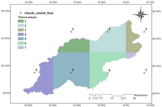 Theissen polygon method is applied in order to calculate the effective rainfall depth for each storm event by specifying an area, for each rainfall data. The seven extracted rainfall data points and their Voronoi polygons created by Theissen polygon method are demonstrated in Figure 4.
