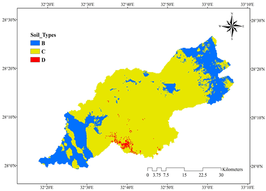 All Egyptian Eastern desert land cover is classified as Barren or Sparsely Vegetated. Referring to (Cronshey, 1986) CN values are 49, 68, 79, and 84 for hydrologic soil type A, B, C, and D for Desert shrub in arid and semiarid rangeland. So it is essential to find the hydrologic soil type of the study area to calculate the CN value and their coverage area.