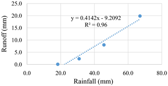 The results of applying SCS model represented in the previous sections are shown in Table 3. The table shows the peak discharges flowing from the three basins affecting Ras Gharib region when applying different rainfall depths. The table also illustrates the runoff volume for each basin. It is shown that the runoff depths are 19.86, 8.00, 2.32 and 0.06 mm for the return periods 100, 50, 25 and 10 years respectively. As a result of these runoff depths, the total surface runoff volumes reach the study area are 34.78, 14.02, 4.07, and 0.11 Mm3, respectively for the selected return periods. The total volume of surface runoff represents 13.74% of the applied rainfall. The relationship between rainfall depths and runoff depths for different storm events return periods is shown in Figure 6 where rainfall-runoff depths are well correlated with a relatively high correlation coefficient (R2 = 0.96).