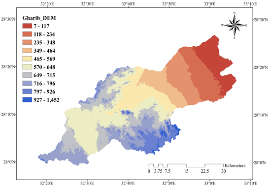 Digital elevation model (DEM) is a digital representation of the surface topography. The DEM of Ras Gharib region is extracted, using ArcGIS with Spatial Analyst Extension, from ALOS World 3D - 30 m (AW3D30) version 2.1 released in April 2018 (Takaku & Tadono, 2017) . The DEM has a resolution of 1-arc second (~30 m). The DEM is essential to calculate topographic parameters needed in watershed delineation such as basin slopes, stream lengths, and sub-catchment boundaries. In addition, it is important in estimating the hydrologic parameters such as flow direction, flow accumulation, stream networks, longest flow length, and watershed delineation. Figure 2 shows the ground elevation of the study area in meters after geo-referencing it to UTM WGS84 36 N, which indicates that the study area is slopping towards the East direction to the Red Sea Coast with elevation ranges from 7 m to about 1500 m.