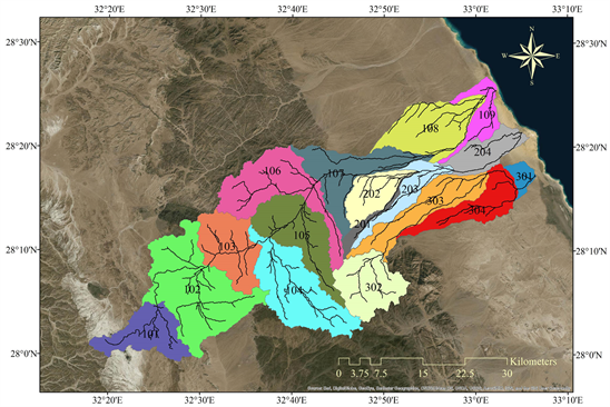 The watershed delineation for Ras Gharib region is accomplished using ArcMap10 GIS software. All the morphological parameters needed are calculated using the Hydrology Tool in ArcGIS and the 1-arc second DEM including determining the catchments boundaries, flow direction, flow accumulation, and main streamlines network. Figure 3 demonstrates the basins and main streamlines generated using the ArcGIS after specifying three outlets in the study area. The total area of the three basins conveying their surface runoff to Ras Gharib region is about 1750 km2. The three basins are then divided to sub-catchments to facilitate the runoff calculations in next steps. The generated streams are compared to Google Earth satellite images where a good matching is observed. Table 1 shows the area and average slopes for each sub-catchments.
