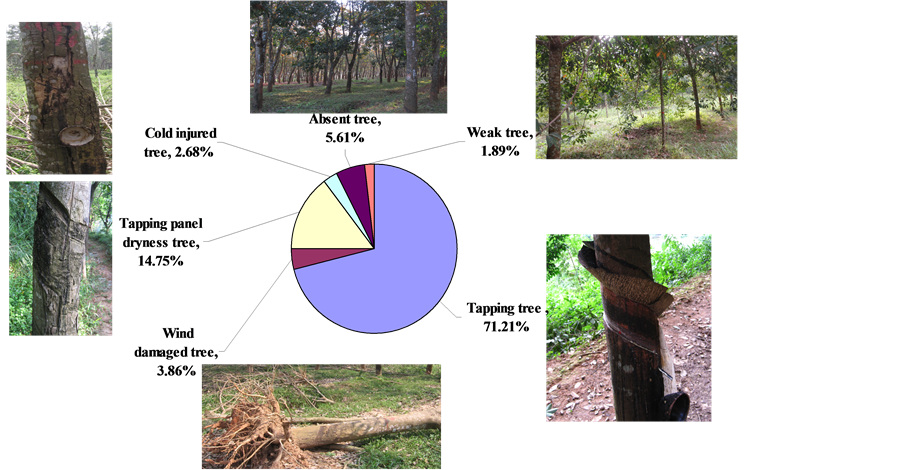 This investigation showed that there were six kinds of existing plant types of rubber tree after planting of rubber plantations (Table 1), which were available tapping trees, wind damaged trees, cold damaged trees, tapping panel dryness trees, absent trees and weak trees, respectively. From the point of view of all varieties survey,