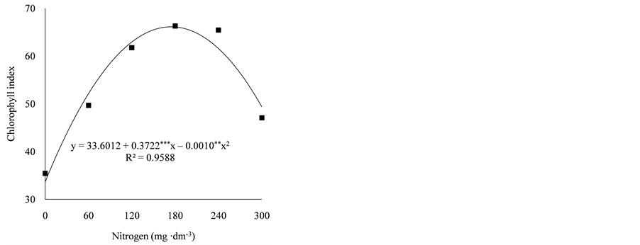 The influence of nitrogen in the chlorophyll content was observed by the reference [21] , who found significant effect on the chlorophyll content of safflower plants in bloom due to nitrogen fertilization, where the two doses studied, 100 and 200 kg∙ha−1, provided a higher amount of chlorophyll content (66.3 and 66.7, respectively) when compared to the treatment without nitrogen fertilizer (62.0).