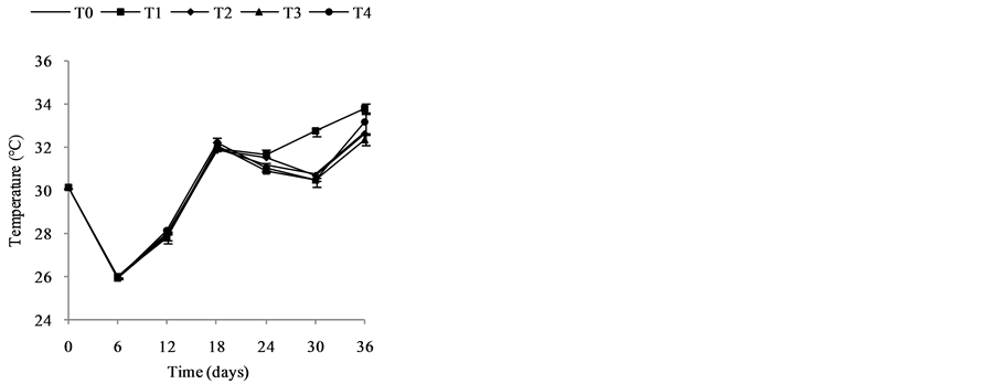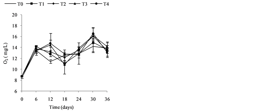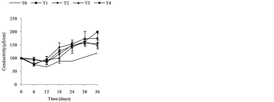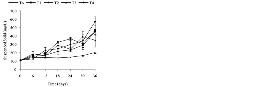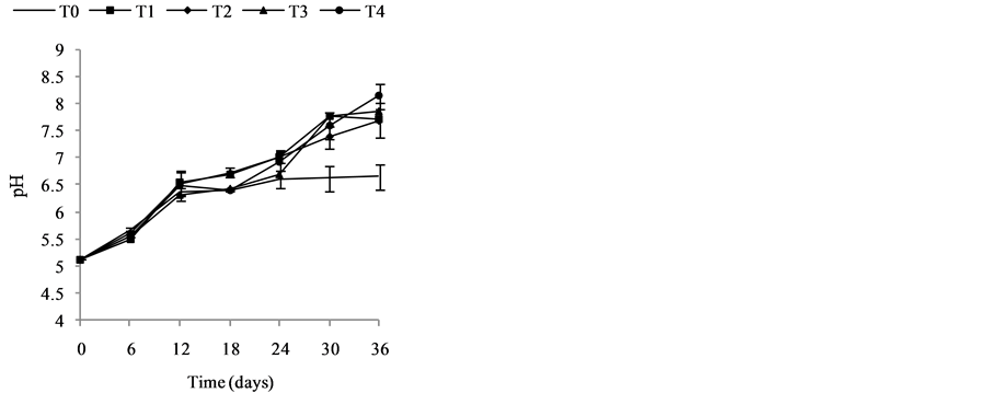 Change in temperature (Figure 2(c)), dissolved oxygen (Figure 2(a)), conductivity (Figure 2(d)), and Ph (Figure 2(b)) during the 36 days of experiment is depicted in Figure 2. In general, the values of the water temperature fluctuate between 25.90˚C and 33.77˚C approximately. The values observed are similar in all treatments and vary according to the weeks of experiment. However, there is a drop in global temperature after a week of fertilization in all treatments and increase during the 3rd and 6th week. These temperatures observed are those of mesophilic microorganisms therefore support the biodegradability of organic matter in pig manure. The temperature rise observed the 3rd and 6th week shows activation of metabolic reactions of nutrients released by microorganisms. Dissolved oxygen affects life in ecosystems. The average values of dissolved oxygen registered during the experiment are between 8.36 mg/L and 16.57 mg/L. However, in the 3rd and 6th weeks a decrease in the concentration of dissolved oxygen in all treatments was observed; this can be correlated with the increase in temperature observed in the third and sixth week of experimentation. In fact, aerobic microorganisms whose metabolic activity is activated by the rise in temperature consume then enough oxygen for faster degradation of organic matter. pH values at the start of experiment were low and indicate relatively acidic water (5.13). These values range 5.13 to 8.14 at the end of experiment, whereas in the control treatment T0, the pH remained rela- tively low. The contribution of manure resulted in a gradual increase in the pH which reached 8.14 especially in T4. This indicate a propensity to alkalinity in water containing pig manure mainly due to a release of NH3 from
