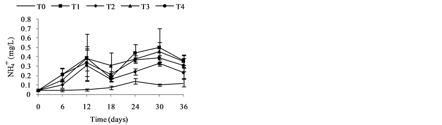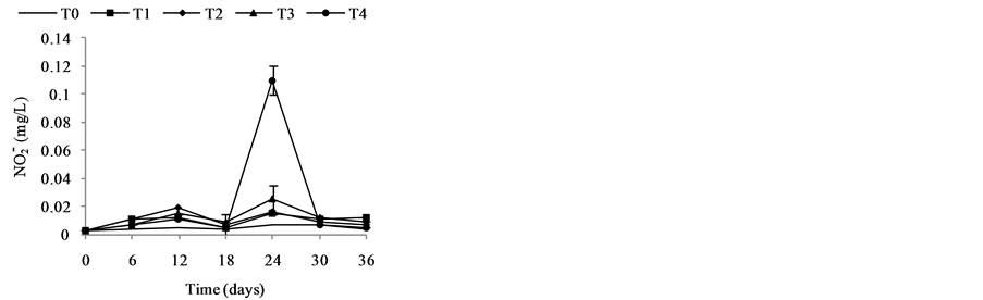 tained with T4 during the fourth week. Also there is a decrease of nitrite content in treatments T1 to T4 during the 3rd and 6th weeks. These variations observed are related to the activities of micro-organisms in the water that influences nitrogen availability with
