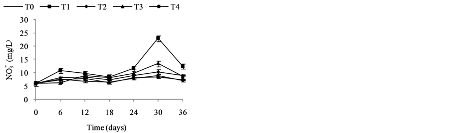 High levels of suspended solids matters and stored water conductivity in T1 to T4 are due to the high release of nutrient in the area and confirm the results of Belghiti et al. [25] who proved the mineralization effect on wa- ter mineral contents. For good manure, organic matter decomposition process is performed by heterotrophic bacteria which consume dissolved oxygen to release the nutrients such as ammonium, nitrite, nitrate and phos- phate and carbon dioxide [28] The values recorded for nitrites during different sampling campaigns are in ac- cordance with the optimum value required 0.1 mg/L [29] for aquaculture water. However, high level of nitrites (1.11 mg/L) obtained with T4 after 4 weeks of fertilization might be due to physico-chemical and biological process taking place in this environment [30] . Indeed, during the degradation process of organic matter by mi- croorganisms there is an ammonia oxidation or reduction of the nitrate which induce a release of nitrous ions in the area. This could justify the findings observed in all the treatments except, To at the 3rd and 6th week of expe- riment in which there has been a substantial decline in the rate of nitrogenous nutrients in fertilized water based on pig waste level. As for nitrates, these values are much higher than the standard set for surface water is 0.1 mg/L for freshwater aquaculture [31] .