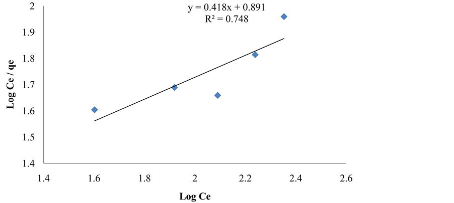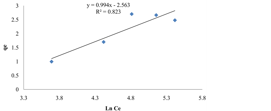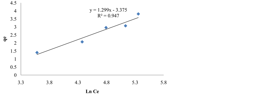Figures 1-6 show that the equilibrium concentration and the amount of naphthalene adsorbed increased as the initial effluent concentration increased. The Langmuir, Freundlich and Tempkin Isotherm constants were calculated from the slope and intercepts of the graphs. The Freundlich Isotherm plot in Figure 3 gave the best linear plot with a correlation coefficient (R2 = 0.9647) for naphthalene sorption with clay. The Langmuir isotherm plot in Figure 4 gave the best linear plot with a correlation coefficient (R2 = 0.8602) for naphthalene sorption with sandy soil. The experimental data for this work best fits the Freundlich model. This result agrees with the work of [10] in which clay adsorbent was also used. The adsorption capacity Qo (mg/g) and energy of adsorption n for naphthalene were 5.734 and 0.0107, respectively.