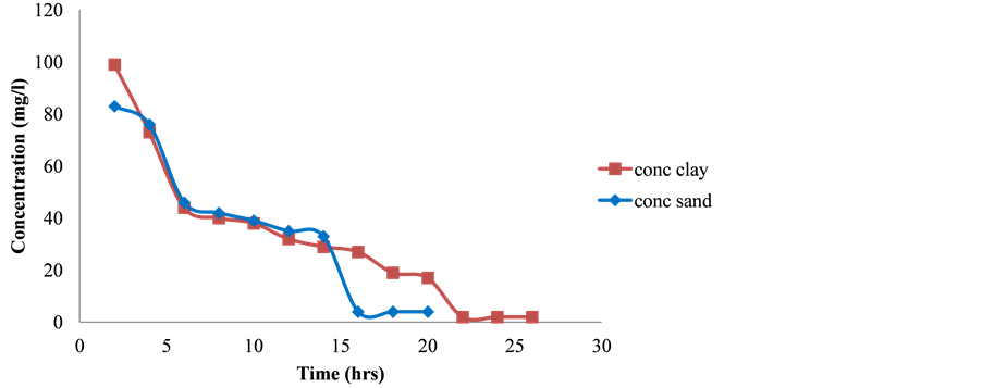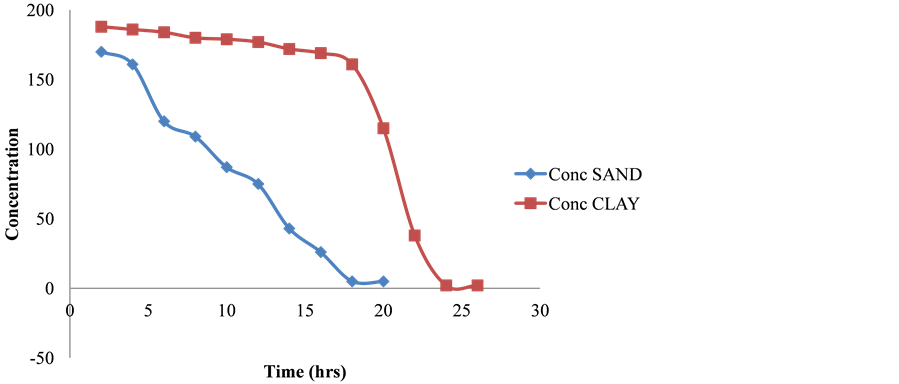 Figure 7. Variation of concentration with time for naphthalene sorption in clay and sandy soil.