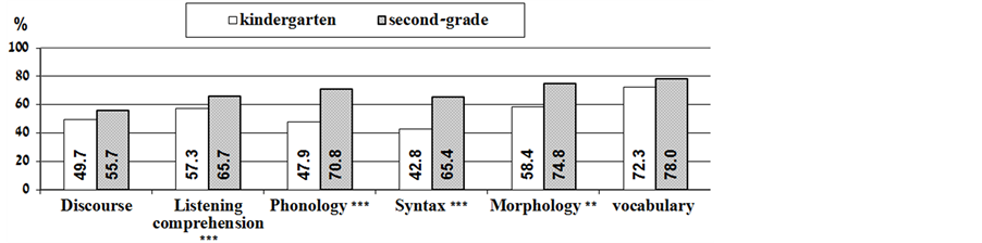 In the HG group, significant progress was found in all literacy measures: discourse (t(180) = 6.82, p < 0.001), listening comprehension (t(180) = 5.04, p < 0.001), phonology (t(180) = 11.72, p < 0.001), syntax (t(180) = 10.35, p < 0.001), morphology (t(180) = 0.73, p < 0.001) and vocabulary (t(180) = 10.56, p < 0.001) (see Figure 4).
