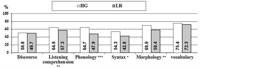 In the HG group, higher performance was noted in listening comprehension (M = 69.69, SD = 13.75) compared to reading comprehension measure (M = 66.32, SD = 20.08), (t(180) = −2.91, p < 0.01). Similarly, in the LR group, better listening comprehension skills (M = 65.72, SD = 11.) were observed when compared to reading comprehension (M = 45.13, SD = 22.27), (t(24) = −5.80, p < 0.001).