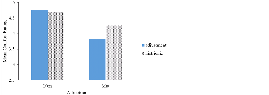 A 2-way repeated measures ANOVA was used to test comfort levels in referring a client out when feelings of sexual attraction were non-mutual vs. mutual and the client was diagnosed with either an adjustment disorder (no sexually provocative behavior exhibited) or a histrionic personality disorder (sexually provocative behavior exhibited). The main effect of attraction was significant (F (1, 38) = 3.94, p = 0.05,