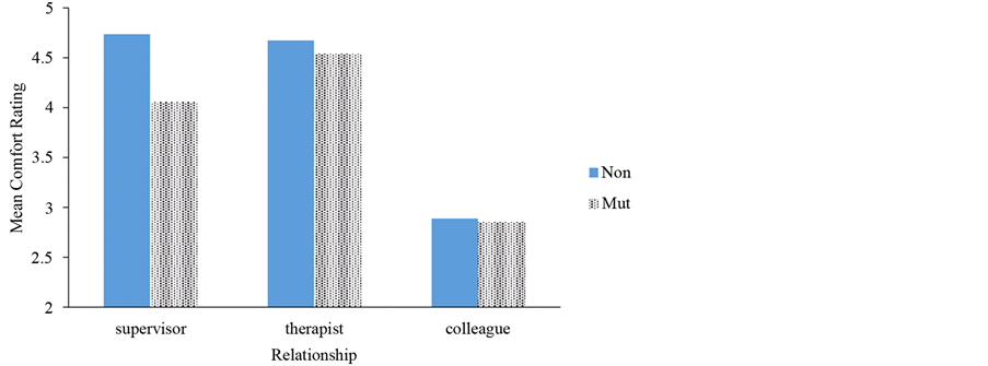 = 0.46. The pattern of overall cell means (collapsing across attraction and diagnosis) indicated that students felt more comfortable talking with their own therapist relative to either their supervisor or a colleague. The pairwise comparisons for the main effect of relationship using Fisher’s LSD test showed a significant difference between supervisor and therapist (p = 0.05), supervisor and colleague (p < 0.001), and therapist and colleague (p < 0.001). However, there was a significant interaction between attraction and relationship (F (2, 70) = 5.25, p = 0.008,