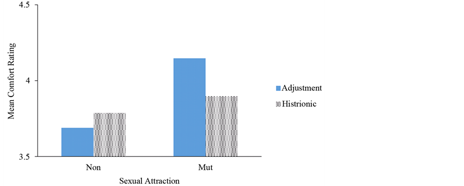 = 0.18). When sexual feelings were mutual, students were much less comfortable discussing the case with their supervisor when the client was diagnosed with an adjustment disorder than with a histrionic personality disorder, but when feelings were non-mutual there was little difference between comfort ratings as a function of diagnosis (Figure 1).
