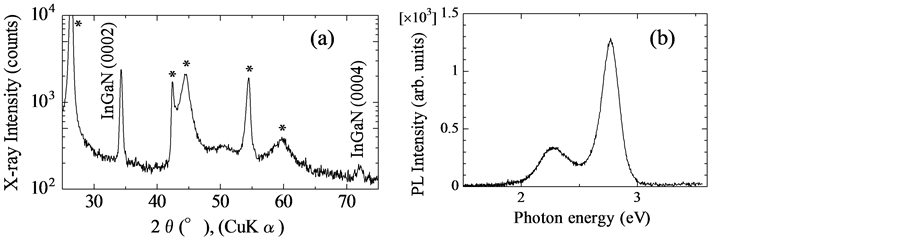 Figure 6. (a) XRD pattern and (b) PL spectrum of the In0.1Ga0.9N thin film grown directly on the amorphous-carbon-coated graphite substrate. The growth temperature of the film was 800˚C. Asterisks in figure (a) mean XRD peaks of the amorphous-carbon-coated graphite substrate.