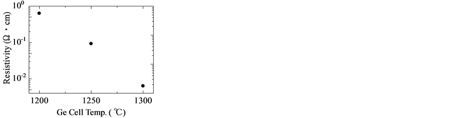 Highly c-axis oriented films were obtained and increases of the near band-edge emission intensities by Ge doping were confirmed about the thin films directly grown on the non-single-crystalline substrates as described above section. Some effects of Ge or Mg-doping to GaN thin films grown on non-single-crystalline substrates are described in this section. Firstly, effects of n-type Ge-doping were investigated on the resistivity of the GaN thin films. The Ge-doped GaN thin films were directly grown on the quartz glass substrate. The growth temperature was fixed to 900˚C, and the Ge cell temperature was varied from 1200˚C to 1300˚C. The variation of the resistivity is shown in Figure 8. The resistivity gradually decreased with the increase of the Ge cell temperature, that is, free electron density increased by the increase of the amount of the n-type impurity. The carrier density in the thin film was confirmed by a Hall effect measurement, and it reached to 3 × 1020 cm−3 when Ge was doped to it at the cell temperature of 1300˚C. Thus, Ge doping is quite effective to obtain GaN thin films of high carrier density when the film is grown on the non-single-crystalline substrate similarly to the epitaxial nitride thin films.
