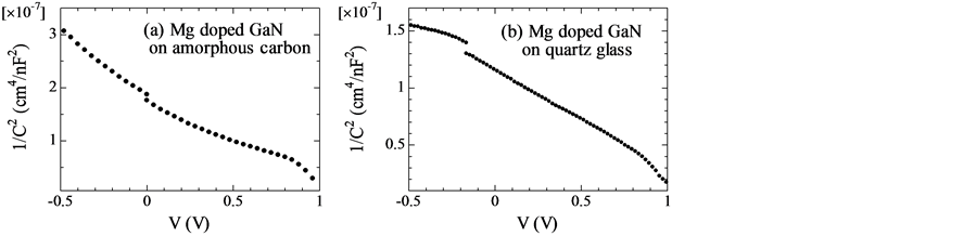 The conducting types of the obtained thin films were evaluated by the ECV measurements. KOH aquatic solution was used for fabrications of Schottky contacts to the Mg-doped GaN thin films. On the other hand, the amorphous-carbon substrate has relatively high conductivity and an ohmic relationship to the Mg doped GaN thin film. The heavily Ge-doped GaN thin film grown as the conductive underlayer on the quartz glass substrate also has a similar ohmic relationship to the Mg-doped GaN thin film. Therefore, the amorphous-carbon substrate and the heavily Ge-doped GaN underlayer were respectively used as ohmic contacts in the ECV measurements.