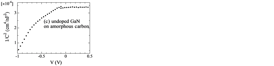 Figure 9 shows the Mott-Schottky plots about the Mg-doped GaN thin films obtained from the ECV measurements. The directions of the slopes in these plots are clearly different between the cases of the Mg-doped GaN thin films and the undoped n-type GaN thin film. Usually, undoped GaN shows n-type conduction because of naturally occurred nitrogen vacancies or excess metallic Ga. It can be determined that the undoped GaN thin film has n-type conduction property from the result of the ECV measurement as shown in the Figure 9(c). On the other hand, the measurement results on the Mg-doped thin films show clearly opposite direction of the slopes, that is, the slopes declined with the increase of the applied voltage. Therefore, it can be determined that the conduction type of the each Mg-doped film is p-type. The ECV measurements were carried out under applying alternating voltage of 69 Hz to avoid effects of the relatively high impedance of the KOH aquatic solution on the decrease of applied voltage to the GaN thin films. Therefore, estimated values of acceptor concentrations in the films might include the number of non-activated acceptors. Nevertheless, it was shown that p-type GaN thin films could be obtained on such non-single-crystalline substrates.