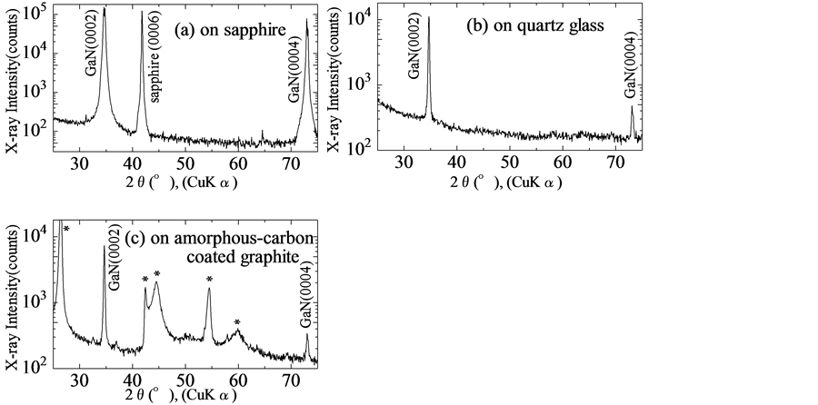 Figure 1. XRD patterns of the GaN thin films grown directly on the (a) c-face single-crystalline sapphire, (b) quartz glass, and (c) amorphous-carbon-coated graphite substrates. The growth temperature of the films was 900˚C. Asterisks in figure (c) mean XRD peaks of the amorphous- carbon-coated graphite substrate.