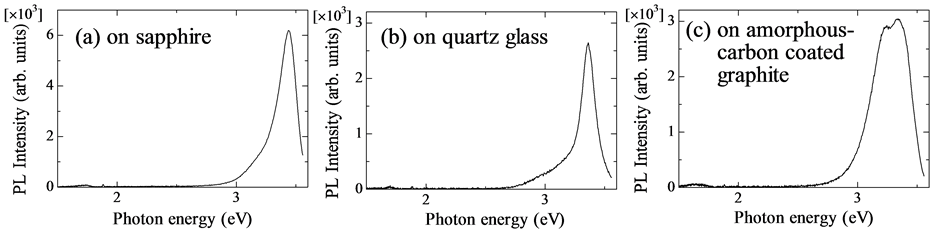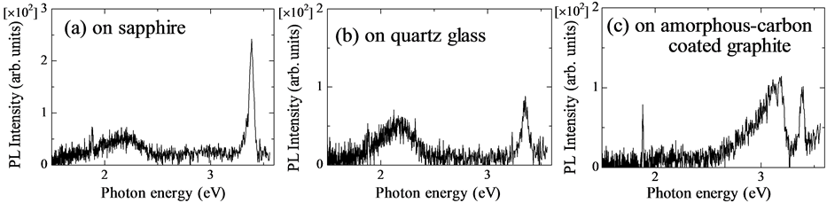 Figure 2 shows PL spectra of the GaN thin films grown on the same substrates described above. Band-edge emission at the higher photon energy and deep-level emission at the lower photon energy are respectively observed in the PL spectrum of the GaN thin film grown on the quartz glass substrate as shown in Figure 2(b). This is similar to the case of the film grown on the sapphire substrate shown in Figure 2(a) though the emission intensity of the band-edge emission at the higher energy side is weaker than that of the film grown on the sapphire substrate. On the other hand, broad emission peak at around 3 eV is observed in addition to the band-edge emission at the higher energy side in the PL spectrum of the GaN thin film grown on the amorphous-carbon- coated graphite substrate. It is different from the other PL spectra of the GaN films grown on the quartz glass or sapphire substrates.