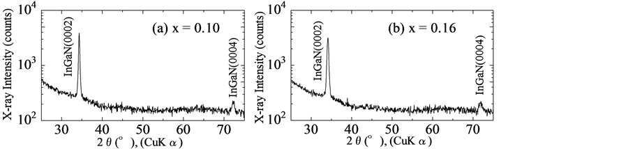 Figure 4. XRD patterns of the InxGa1−xN thin films grown directly on the quartz glass substrates. The growth temperature of the films was fixed to 800˚C. The molar fraction x of the obtained thin films were (a) 0.10 and (b) 0.16, respectively.