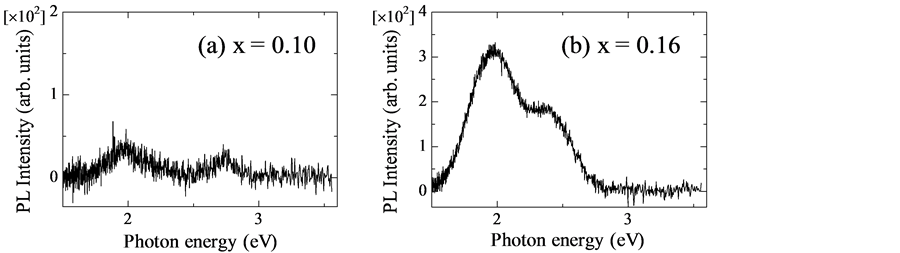 Figure 5. PL spectra of the InxGa1−xN thin films grown directly on the quartz glass substrate. The growth temperature of the films was fixed to 800˚C. The molar fractions x of the obtained thin films were (a) 0.10 and (b) 0.16, respectively.