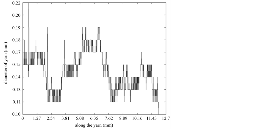 To determine yarn diameter, we scanned 25 SEM samples of different yarns in 2000 dpi and 256 grayscale. Length of each sample was 30 cm. Figure 4 shows a part of diameter variation along the one sample yarn.