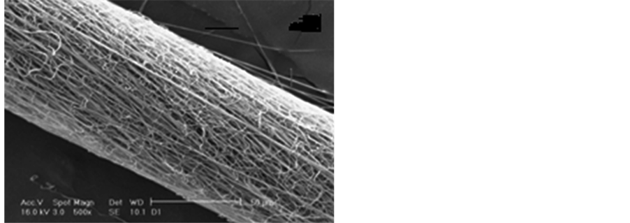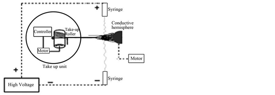 The schematic setup for preparing nanofiber yarn is presented in Figure 1 [12] [13] . In this method, a high voltage DC supplier creates an electrostatic field between two nozzles with opposite charge. Also, it consists of a high voltage-power supply, two syringe needles, a conductive hemisphere, a feeder unit and a take up unit. The hemisphere diameter was 8 cm. The syringe needles were located 2 cm from the hemisphere and 21 cm from take up unit. Electrospinning was done between two syringe needles, then electrospun nanofibers collected on hemisphere surface and twisted by rotating the hemispherical collector. Take up unit can twist the yarn without forming a balloon while taking up the yarn. The take up unit was controlled by a three phase motor for twisting the yarn and was controlled by an inverter. A stepper motor controlled the speed of take up and was controlled by a microcontroller. To provide the required input current for the stepper motor, a buffer was used to connect the output port of microcontroller to the stepper motor. Users can control the rotation speed of the stepper motor with a switch connected to the input port of the microcontroller. After production of the yarn, they were heat treated and stretched two times. The value of twist per meter was 2900. For this purpose, each yarn was drawn by fastening end of yarn with fixed jaw and drawing it in hot water (100˚C). This procedure causes improvement in the strength of yarns [14] [15] . Figure 2 shows typical SEM of heat setted nanofiber yarn.