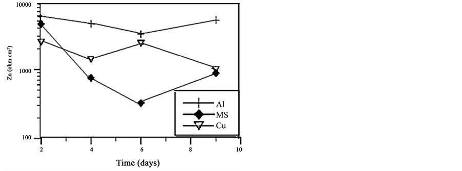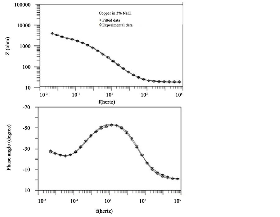 Figure 6 shows the experimental and fitted impedance data for copper exposed to 3% NaCl for 1 day. The experimental data were fitted using the Randless circuit [13] . Excellent agreement between the fitted and experimental data was obtained Figure 7. Comparing Zn with impedance resistance Zp showed a general agreement for the tested alloys (Figure 7).