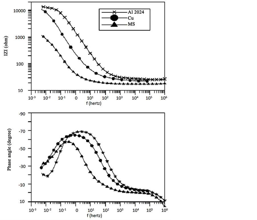 Figure 5 shows a comparison between the impedance spectra obtained for Al, Cu and mild steel exposed to NaCl for 12 days. It is obvious that the shape of the impedance spectra is very characteristics for each alloy. As described elsewhere [14] -[16] . A localized mechanism was observed for Al, uniform corrosion mechanism for mild steel and a diffusion controlled mechanism could be suggested for copper. Impedance data were fitted according to the suitable equivalent circuit as described before [13] - [17] .