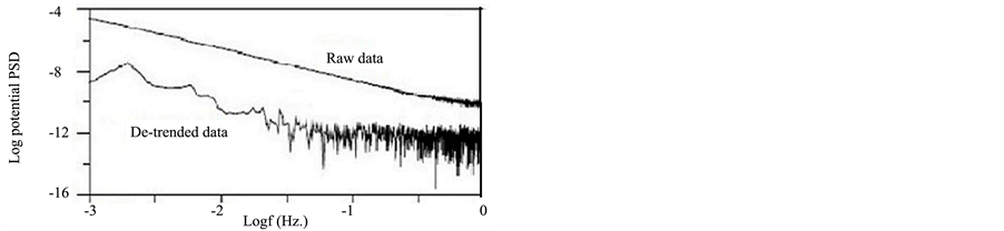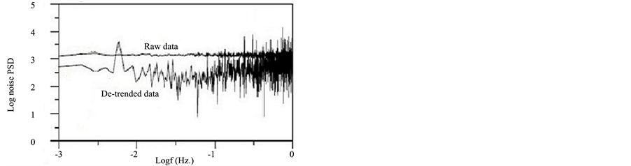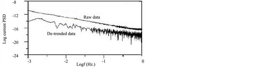 where VFFT and IFFT are the Fast Fourier Transformer functions of the potential and current noise, respectively, and VPSD and IPSD are the corresponding power spectral density (PSD) plots. SV and SI are the slopes of the PSD plots of potential and current noise, respectively. The spectral noise resistance (Zsn) could be defined as the DC limit of Zsn (f) plots, in the same way like Zp, which is defined as the limit of impedance when the frequency tends to zero [20] . Figure 8(a) and Figure 8(b) show the VPSD plots and IPSD plots obtained after FFT of potential and current fluctuations, respectively for MS exposed to NaCl before and after removing the DC trend. It is clear that the presence of trend greatly affect the amplitude and the shape of PSD plots. In this case, higher amplitude in both current and potential PSD plots was observed for the raw data than for the de-trended data. Consequently, Zsn plot for raw data will be higher in amplitude than the de-trended one (Figure 8(c)). In