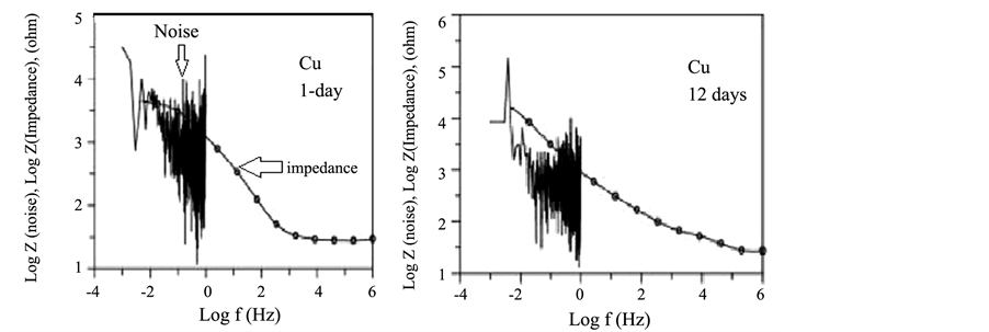 Figure 9(a) shows a comparison between the impedance and spectral noise plots of copper exposed to NaCl for 1 and 12 d, respectively. No good agreement was observed between the spectral noise plots and the impedance plots. On the other hand a good agreement was obtained between the impedance and spectral noise plots for Al 2024 and MS 1018 exposed to NaCl for 9 days (Figure 9(b)).