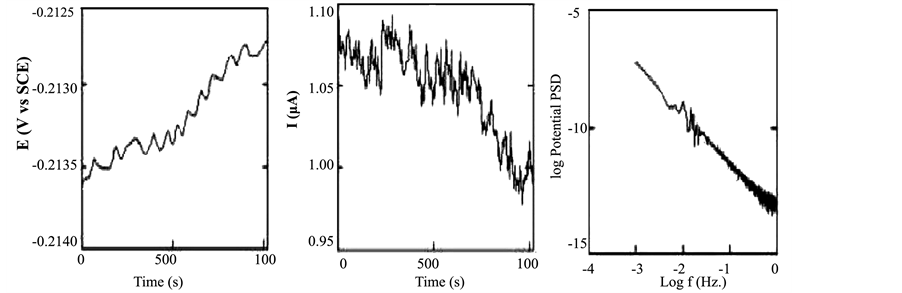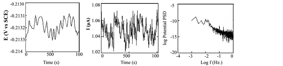 EN were performed in a set-up with electrochemical cell consisted of two identical working electrodes with an exposed area of 1.0 cm2 for each electrode and a saturated calomel electrode (SCE) as a reference electrode within a Faraday cage. An AutoCAD DSP device (ACM Instruments) was used to collect potential and current fluctuation simultaneously. Potential and current fluctuations were obtained, with a sampling rate of 2-point s−1 during a time period of 1024 seconds, which fixed the frequency range (Δf) in region between 1 Hz and about 1 mHz. The instrument noise was tested and shown to be with no influence on the noise measurements. A polynomial trend removal method was performed to remove the direct current (DC) drift contained in the noise data and a Hann window was applied before computing the PSD plots. The analysis of EN data in time and frequency domain was developed using Mathcad. The time-series data of the potential and current fluctuations were trans- formed into frequency domain by using the fast Fourier transformation (FFT) method.