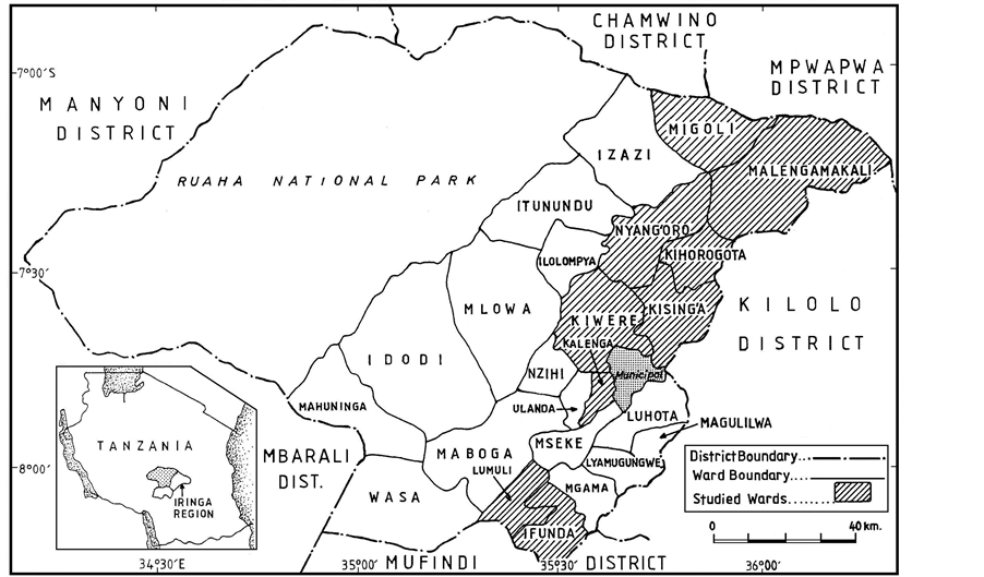 The study was carried out in twenty-six villages selected from seven wards of Iringa rural district in Iringa region (Figure 1). The district lies at 1600 m to 2700 m above sea level in southern highlands of Tanzania. Temperatures are normally below 15˚C with rainfall ranging between 1000 mm to 1600 mm per annum falling in a single season from November to May. The dry and cold seasons occur after the rain season and lasts from June to September.