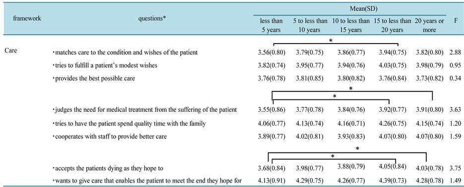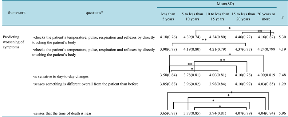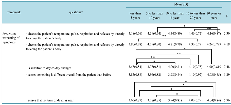 In the results of analysis, the clinical nursing competencies of HPNs that showed significant difference among the 5 groups of clinical nursing experience were: in care [HPN matches care to the patient’s condition and needs that differ by the day, (F (4,953) = 2.88, p < 0.05)], [HPN judges the need for medical treatment from the suffering of the patient, (F (4,953) = 3.63, p < 0.05)] and [HPN accepts the patients dying as they hope to, (F (4,953) = 3.75, p < 0.01)]; and in prediction of worsening of symptoms [HPN checks the patient’s temperature, pulse, respiration and reflexes by directly touching the patient’s body, (F (4,953) = 5.30, p < 0.01)], [HPN chooses measuring methods with the least burden according to the patient’s condition, (F (4,953) = 4.19, p < 0.01)], [HPN is sensitive to day-to-day changes, (F (4,953) = 7.48, p < 0.01)] and [HPN senses that the time of death is near, (F (4,953) = 5.96, p < 0.01)].