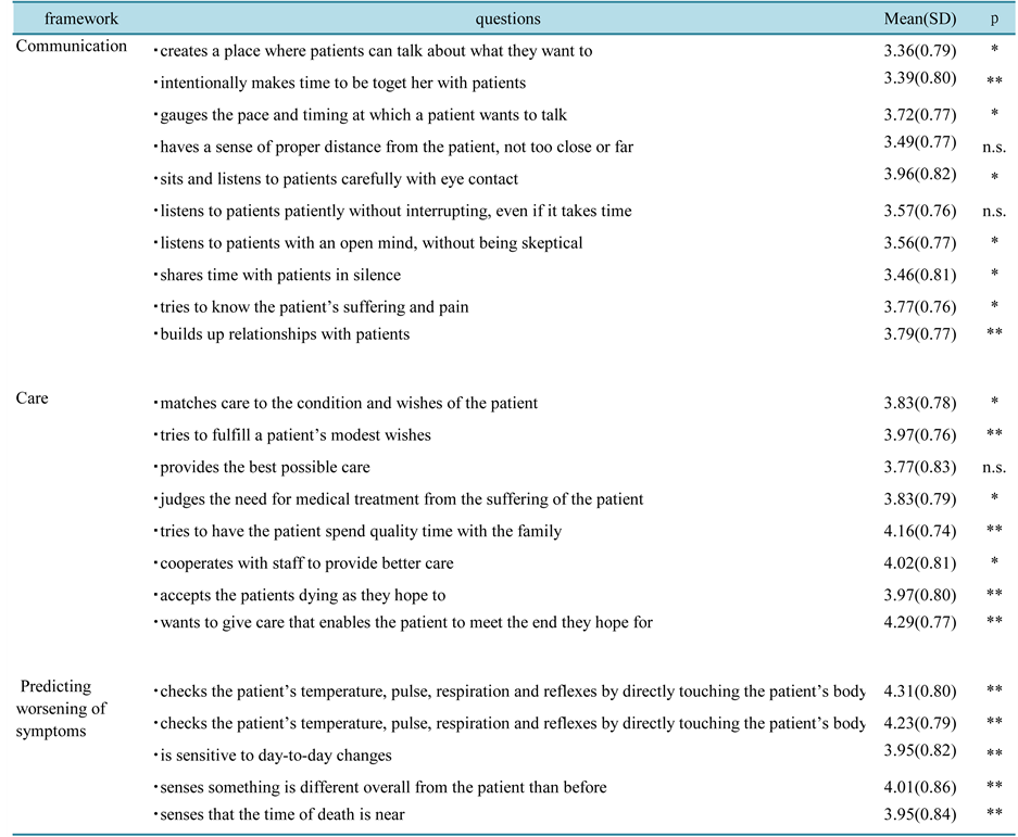 In the results of the Mann-Whitney U test, significant differences between the 2 groups of training experience were: in communication [HPN creates a place where patients can talk about what they want to (p < 0.05)], [HPN intentionally makes time to be together with patients (p < 0.01)], [HPN gauges the pace and timing at which apatient wants to talk (p < 0.05)], [HPN sits and listens to patients carefully with eye contact (p < 0.05)], [HPN listens to patients with an open mind, without being skeptical (p < 0.05)], [HPN shares time with patients in silence (p < 0.01)], [HPN faces the patient’s hardships (p < 0.05)] and [HPN builds up relationships with patients, p < 0.01]; in care [HPN matches care to the patient’s condition and needs that differ by the day (p < 0.05)], [HPN tries to fulfill a patient’s modest hopes (p < 0.01)] [HPN judges the need for medical treatment from the suffering of the patient (p < 0.05)], [HPN cooperates with staff to provide better care (p < 0.05)], [HPN tries to have the patient spend quality time with the family (p < 0.01)], [HPN accepts the patients dying as they hope to (p < 0.01)] and [HPN wants to give care that enables the patient to meet the end they hope for (p < 0.01)]; and in prediction of worsening of symptoms [HPN checks the patient’s temperature, pulse, respiration and reflexes by directly touching the patient’s body (p < 0.01)], [HPN chooses measuring methods with the least burden according to the patient’s condition (p < 0.01)], [HPN is sensitive to day-to-day changes (p < 0.01)], [HPN senses something is different overall from the patient than before (p < 0.01)] and [HPN senses that the time of death is near (p < 0.01)].