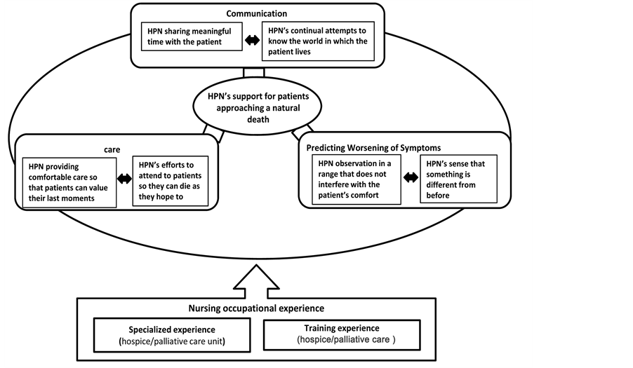 In hospice/palliative care, communication through a good patient-nurse relationship is the foundation of efective care [15] [16] . In this survey, no difference in the abundance of clinical nursing experience and clinical nursing competence in communication is seen. This result supports the report that communication skills cannot necessarily be developed even with clinical nursing experience as a nurse [17] . However, compared to HPNs with less than 2 years of specialized nursing experience, HPNs with longer specialized nursing experience have deepened relationships with patients while maintaining a sense of proper distance, an open mind and shared silences. It is known that HPNs with abundant experience have a positive attitude toward death [18] [19] . Being an excellent HPN is also said to involve personal characteristics such as kindness and warmth [16] . In our previous research, we reported that HPNs made efforts to not feel regrets at the death of a patient by giving the best care to the patient and engaging deeply with the patient [1] . All of this suggests that having general clinical nursing experience as a nurse is not enough to be skilled in the clinical nursing competence of communication, but is developed through accumulated nursing practice in the specialized field of a hospice/palliative care unit. It is also possible that the process of accumulating specialized nursing experience leads to having the patient spend quality time with the family and cooperating with staff to provide better care. In addition, HPNs with abundant specialized nursing experience were able to sense that “something is different in the patient” in the prediction of worsening of symptoms. This sense may also be developed through specialized nursing experience, showing observational skills.
