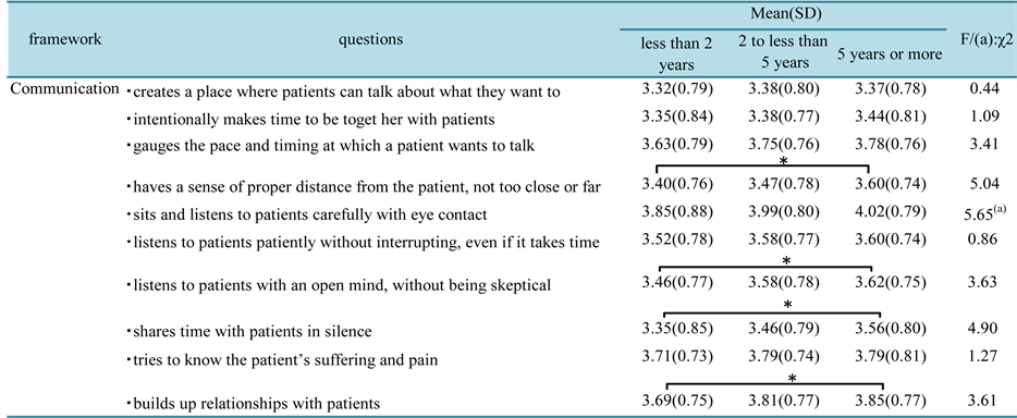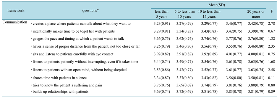 In the results of analysis, significant differences among the 3 groups of specialized nursing experience were: in communication [HPN has a sense of proper distance from the patient, not too close or far (F (2,955) = 5.04, p < 0.05)], [HPN listens to patients with an open mind, without being skeptical (F = (2,955) 3.60, p < 0.05)], [HPN shares time with patients in silence (F (2,955) = 4.90, p < 0.05)] and [HPN builds up relationships with patients (F (2,955) = 3.61, p < 0.05)]; in care [HPN matches care to the patient’s condition and needs that differ by the day (χ2 value = 14.19, p < 0.01)], [HPN judges the need for medical treatment from the suffering of the patient (F (2,955) = 5.63, p < 0.01)], [HPN tries to have the patient spend quality time with the family (F (2,955) = 8.20, p < 0.01)], [HPN cooperates with staff to provide better care (χ2 value = 8.74, df 2, p < 0.05)] and [HPN accepts the patients dying as they hope to (χ2 value = 17.94, df 2, p < 0.01)]; and in prediction of worsening of symptoms [HPN checks the patient’s temperature, pulse, respiration and reflexes by directly touching the patient’s body (F (2, 955) = 7.06, p < 0.01)], [HPN chooses measuring methods with the least burden according to the patient’s condition (F (2, 955) = 10.80, p < 0.01)], [HPN is sensitive to day-to-day changes (χ2 value = 28.80, df 2, p < 0.01)], [HPN senses something is different overall from the patient than before (F (2, 955) = 6.68, p < 0.01)] and [HPN senses that the time of death is near, (χ2 value = 27.56, df 2, p < 0.01)].