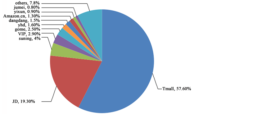 The development of e-commerce websites led consumers to become accustomed to online shopping. According to iResearch latest data show that in Figure 1 [1] , in 2014, the 3rd quarter of Chinese online shopping market transaction size was 691.41 billion RMB, B2C market accounted for 44.2% and Tmall accounted for nearly 60% in B2C market. C2C market can meet online consumers’ differences and individual needs, which will continue to maintain a steady growth in the future. The 35th survey report released by CNNIC showed that [2] , up to December 2014, the scale of Chinese Internet users reached 649 million, of which mobile phone users reached 557 million. Mobile shopping is becoming more and more popular.