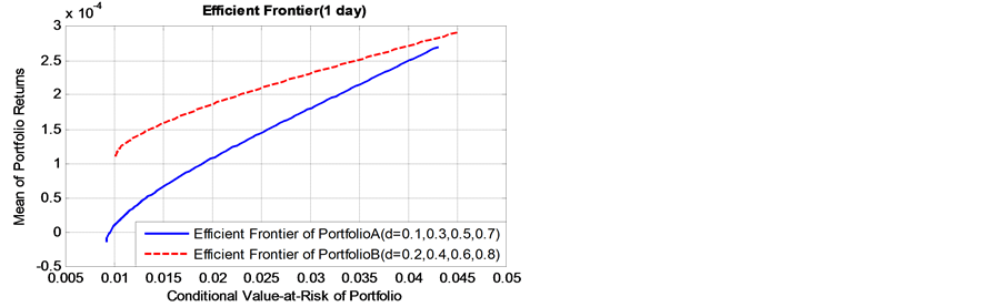 Third, as the risk window becomes longer, the discrepancy between the efficient frontiers with long memory in volatility and without long memory in volatility become lager. This finding indicates that if the long memory is ruled out, the actual risk level will be misestimated, especially in the long-term risk measure, such as monthly and quarterly measure.