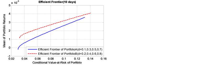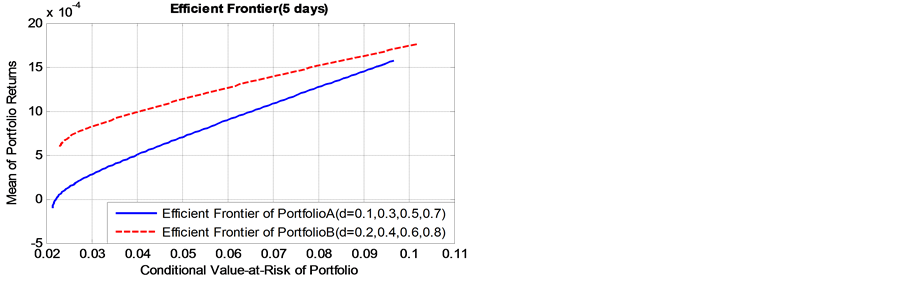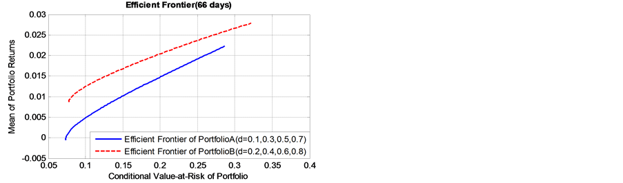 As mentioned in the Section 3, following the procedures of hybrid approach above, we obtain the efficient frontiers of two groups of portfolio under the optimization framework of Mean-CVaR for different risk windows. For sake of brevity, the details are not shown in this paper.