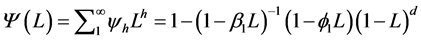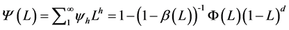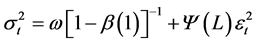 The FIGARCH model, developed by Baillie et al. [10] , enables us to model a slow decay of volatility (long memory behavior), and to distinguish between the long memory and short memory in the conditional variance as well. Formally, the FIGARCH (p,d,q) can be defined as follows: