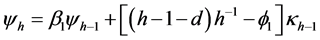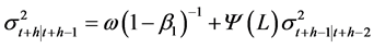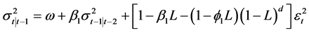 A simple version of the FIGARCH model, which is sufficient to model conditional volatility and appears to be particularly useful in practice, is the FIGARCH (1,d,1) process. The h-period-ahead forecasts of FIGARCH (1,d,1) model is shown in the following (see [29] [36] ).